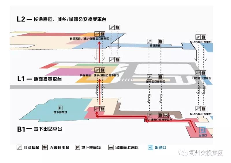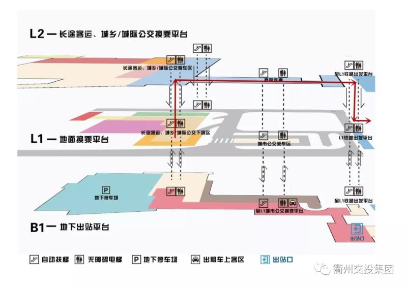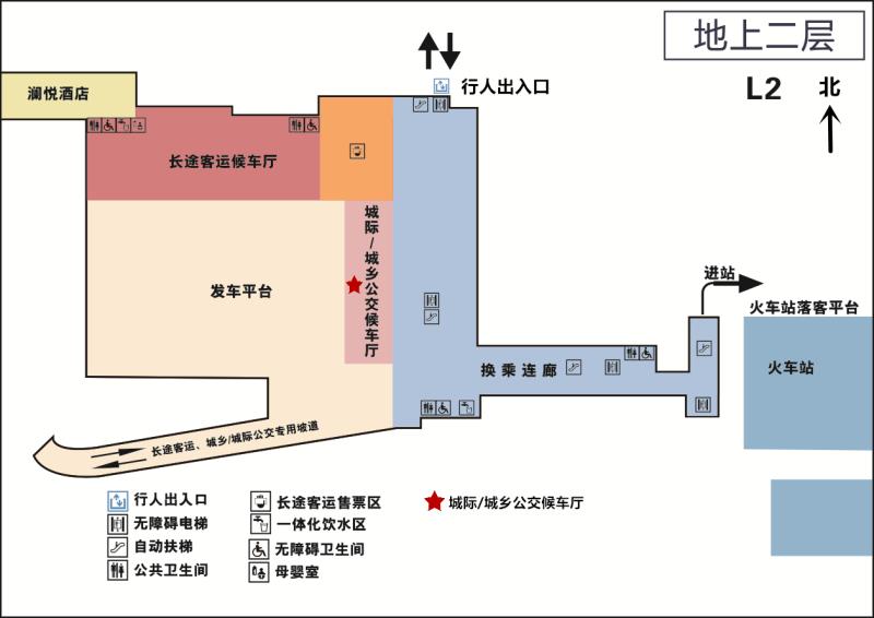 抵達地面一層城鄉(xiāng)/城際公交下客區(qū)——乘坐自動扶梯或無障礙電梯前往二樓——右轉(zhuǎn)后由西向東步行通過換乘連廊——抵達盡頭后乘坐自動扶梯或無障礙電梯向下——右轉(zhuǎn)至鐵路出發(fā)平臺。