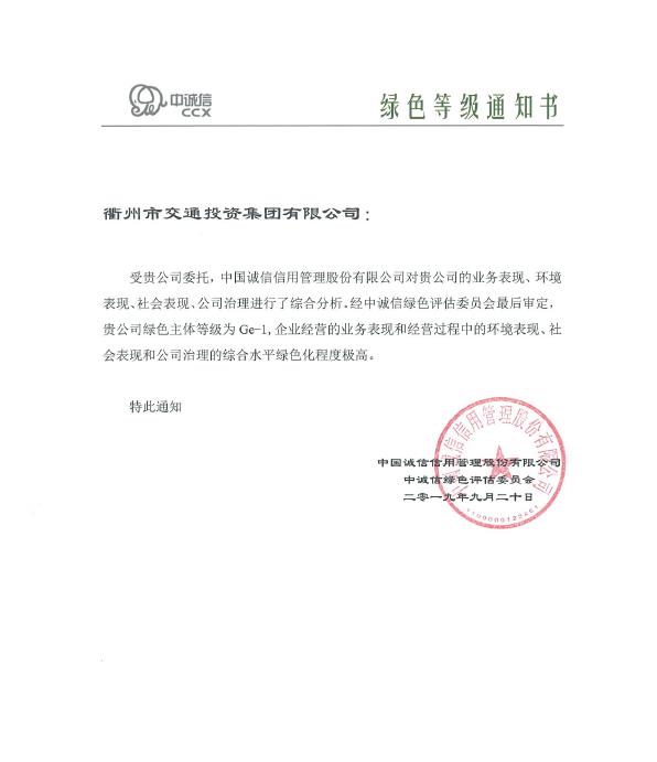 9月20日,國內權威機構中國誠信信用管理股份有限公司發(fā)布,依據(jù)中國金融學會綠色金融專業(yè)委員會編制的《綠色債券支持項目目錄(2015年版)》、中國銀行保險監(jiān)督管理委員會發(fā)布的《綠色信貸統(tǒng)計表(2013年)》、國家發(fā)展和改革委員會發(fā)布的《綠色債券發(fā)行指引》等國家及地方相關標準,認為衢州市交通投資集團有限公司企業(yè)經營的業(yè)務表現(xiàn)和經營過程中的環(huán)境表現(xiàn)、社會表現(xiàn)和公司治理的綜合水平綠色化程度極高,授予Ge-1綠色企業(yè)等級。