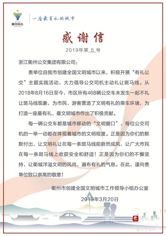 市交通投資集團(tuán)有限公司副總經(jīng)理葉建國表示,“這封感謝信讓我們倍感驚喜和意外,我們將繼續(xù)通過有禮公交的打造,宣傳衢州有禮的品牌形象,制定更嚴(yán)密的措施,為創(chuàng)建全國文明城市添磚加瓦?!?/span>