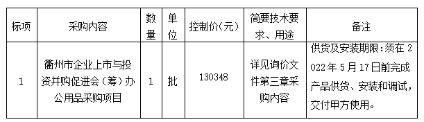 參照《衢州市國資委關(guān)于印發(fā)<衢州市國有企業(yè)采購管理辦法(試行)>的通知》(衢國資發(fā)[2020]36號)、《中華人民共和國政府采購法》、《政府采購貨物和服務(wù)招標(biāo)投標(biāo)管理辦法》等規(guī)定,衢州市智信工程咨詢有限公司受衢州市智慧置業(yè)有限公司的委托,就衢州市企業(yè)上市與投資并購促進(jìn)會(籌)辦公用品采購項(xiàng)目進(jìn)行詢價(jià),本項(xiàng)目為非依法必招項(xiàng)目,現(xiàn)請合格供應(yīng)商參加投標(biāo)。