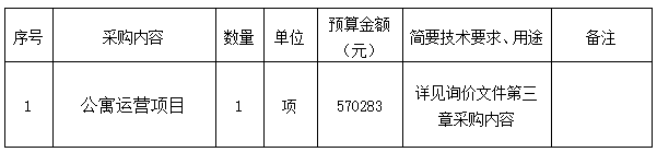 根據《衢州市國有企業(yè)采購管理辦法(試行)》規(guī)定,衢州市智信工程咨詢有限公司受衢州市瑞城科技產業(yè)服務有限公司的委托,就衢州高鐵新城智慧產業(yè)園(五期—1)A區(qū)北側(1-5層)公寓運營項目采購進行詢價,本項目為非依法必招項目,現請合格供應商參加投標。