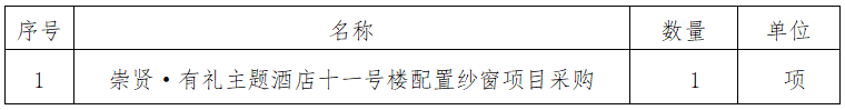 一、采購項(xiàng)目名稱:崇賢·有禮主題酒店十一號樓配置紗窗項(xiàng)目