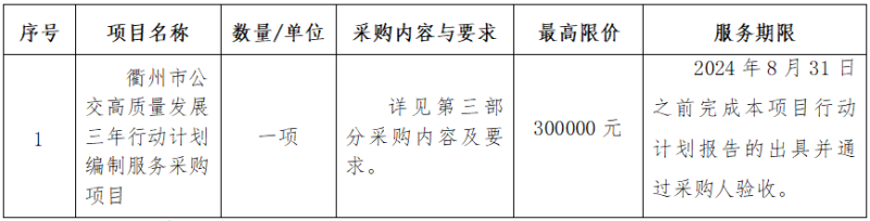 受浙江衢州公交集團(tuán)有限公司委托,現(xiàn)就衢州市公交高質(zhì)量發(fā)展三年行動計(jì)劃編制服務(wù)采購項(xiàng)目進(jìn)行采購。本項(xiàng)目以競爭性磋商方式進(jìn)行采購,歡迎合格的供應(yīng)商參加。
