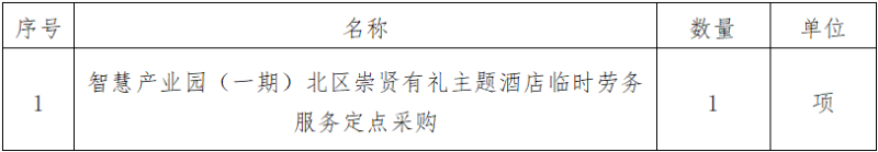 一、采購(gòu)項(xiàng)目名稱:智慧產(chǎn)業(yè)園(一期)北區(qū)崇賢有禮主題酒店臨時(shí)勞務(wù)服務(wù)定點(diǎn)采購(gòu)