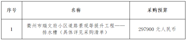根據(jù)《衢州市市屬國有企業(yè)采購管理辦法(試行)》規(guī)定,以公開詢價(jià)方式對(duì)衢州市瑞文府小區(qū)道路景觀等提升工程——排水槽進(jìn)行采購,歡迎合格的供應(yīng)商參加。
