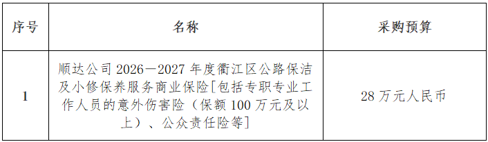 根據(jù)《衢州市市屬國(guó)有企業(yè)采購(gòu)管理辦法(試行)》規(guī)定,以公開詢價(jià)方式對(duì)順達(dá)公司2026-2027年度衢江區(qū)公路保潔及小修保養(yǎng)服務(wù)商業(yè)保險(xiǎn)進(jìn)行采購(gòu),歡迎合格的供應(yīng)商參加。