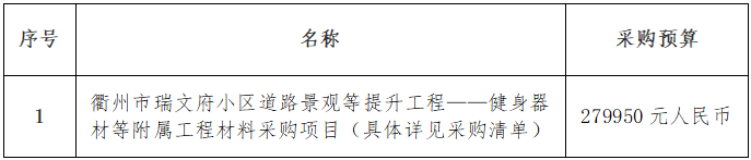 一、項目名稱:衢州市瑞文府小區(qū)道路景觀等提升工程——健身器材等附屬工程材料采購項目