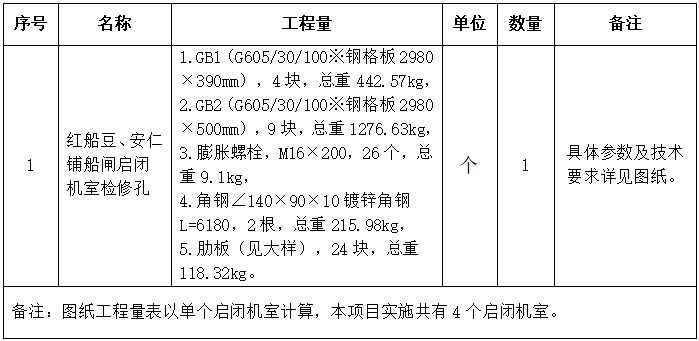 一、采購內(nèi)容:紅船豆、安仁鋪船閘啟閉機(jī)室檢修孔鋼蓋板重新制作及安裝采購,詳見下表,紅船豆、安仁鋪船閘啟閉機(jī)室個數(shù)共4個,采購總預(yù)算價為人民幣111800元(單價不超過27950元/個)。