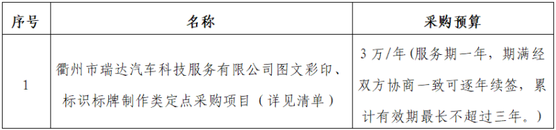 一、項(xiàng)目名稱(chēng):衢州市瑞達(dá)汽車(chē)科技服務(wù)有限公司圖文彩印、標(biāo)識(shí)標(biāo)牌制作類(lèi)定點(diǎn)采購(gòu)項(xiàng)目