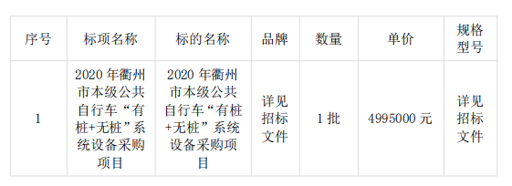 二、項(xiàng)目名稱:2020年衢州市本級公共自行車“有樁+無樁”系統(tǒng)設(shè)備采購項(xiàng)目