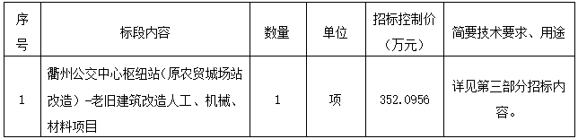 根據(jù)《中華人民共和國招標投標法》、《中華人民共和國招標投標實施條例》等有關規(guī)定,浙江建安工程管理有限公司受浙江衢交建設工程有限公司委托,就衢州公交中心樞紐站(原農貿城場站改造)-老舊建筑改造人工、機械、材料項目進行公開招標。具體如下: