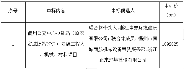 根據(jù)《中華人民共和國招標投標法》等有關法律法規(guī)的規(guī)定,浙江建安工程管理有限公司受浙江衢交建設工程有限公司委托,對其衢州公交中心樞紐站(原農貿城場站改造)-安裝工程人工、機械、材料項目采用公開招標方式進行招標。浙江建安工程管理有限公司于2021年6月18日09時30分在衢州市交通投資集團二樓開標廳(衢州市柯城區(qū)白云街道花園中大道86號)進行開評標。評標結果及相關事宜現(xiàn)公示如下:
