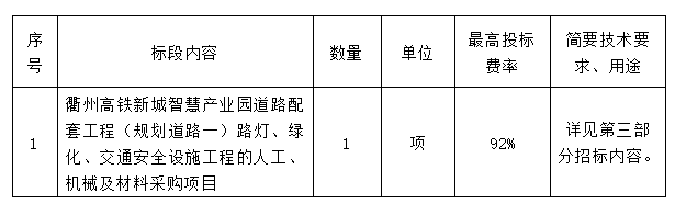 二、項(xiàng)目名稱:衢州高鐵新城智慧產(chǎn)業(yè)園道路配套工程(規(guī)劃道路一)路燈、綠化、交通安全設(shè)施工程的人工、機(jī)械及材料采購(gòu)項(xiàng)目