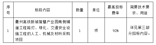二、項(xiàng)目名稱:衢州高鐵新城智慧產(chǎn)業(yè)園南側(cè)輔道工程路燈、綠化、交通安全設(shè)施工程的人工、機(jī)械及材料采購項(xiàng)目