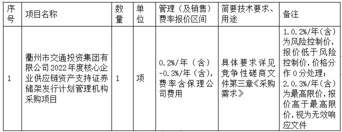 項目名稱:衢州市交通投資集團有限公司2022年度核心企業(yè)供應(yīng)鏈資產(chǎn)支持證券儲架發(fā)行計劃管理機構(gòu)采購項目