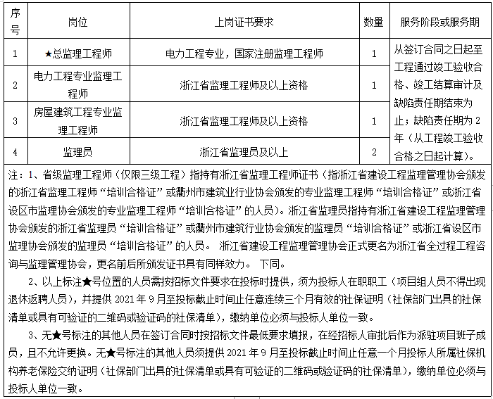 要求具備有效的國(guó)家注冊(cè)監(jiān)理工程師證書,注冊(cè)專業(yè)為電力工程。國(guó)家注冊(cè)監(jiān)理工程師:衢州市區(qū)(含市本級(jí)、柯城區(qū)、衢江區(qū)、智慧新城、智造新城,余同)外不得有在建工程的監(jiān)理業(yè)務(wù)(含已中標(biāo)工程或?yàn)榈谝恢袠?biāo)候選人的監(jiān)理業(yè)務(wù),余同),衢州市區(qū)不得有三個(gè)在建工程的監(jiān)理業(yè)務(wù);