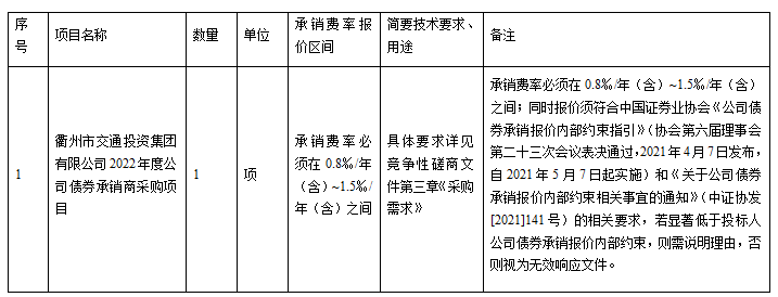 項(xiàng)目?jī)?nèi)容及規(guī)模:衢州市交通投資集團(tuán)有限公司計(jì)劃向上海(或深圳)證券交易所申報(bào)公司債券,申報(bào)總規(guī)模不超過(guò)40億元,發(fā)行期限不超過(guò)10年,擬通過(guò)競(jìng)爭(zhēng)性磋商方式確定本項(xiàng)目承銷商,為采購(gòu)人提供本項(xiàng)目申報(bào)發(fā)行等相關(guān)事項(xiàng),具體要求詳見(jiàn)采購(gòu)內(nèi)容。