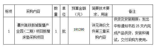 參照《中華人民共和國政府采購法》、《政府采購貨物和服務(wù)招標(biāo)投標(biāo)管理辦法》等規(guī)定,衢州市智信工程咨詢有限公司受衢州市智慧產(chǎn)業(yè)投資發(fā)展有限公司的委托,就衢州高鐵新城智慧產(chǎn)業(yè)園(二期)項(xiàng)目新增床墊采購項(xiàng)目進(jìn)行詢價(jià),本項(xiàng)目為非依法必招項(xiàng)目,現(xiàn)請合格供應(yīng)商參加投標(biāo)。