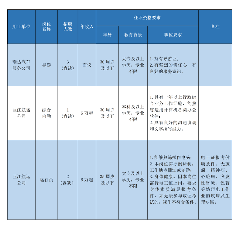 擬招聘導(dǎo)游3名、運(yùn)行員2名,綜合內(nèi)勤1名。