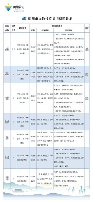 衢州市交通投資集團有限公司根據(jù)集團發(fā)展需要,擬面向社會公開招聘工作人員,具體工作單位由集團根據(jù)工作需要,在集團本部和全資子公司之間進行統(tǒng)籌安排。具體招聘事項安排如下: